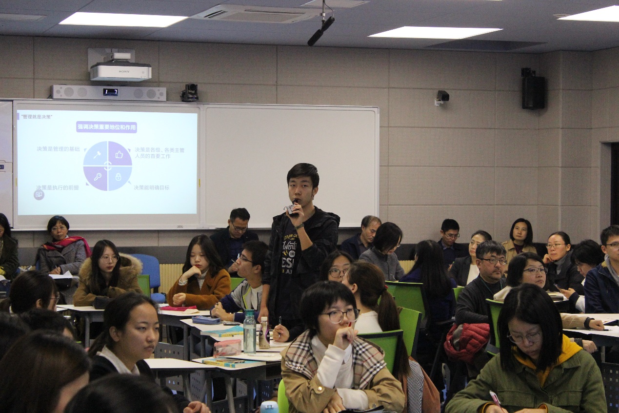 此次课堂的主要内容是西蒙和沃尔多两位学者的行政思想。首先班级三个小组的主讲人分别用五分钟的时间进行发言,向大家展示本小组关于课前认领问题的资料分析和小组成果。在这个过程中,其他同学和张晨老师认真听主讲人的发言,并且积极进行头脑风暴,根据自己所掌握的相关知识对发言的内容进行质疑或者是进一步的追问;这些问题通过“好弹幕”程序直接投屏在教室大屏幕上,以供发言小组成员进行课后进一步的阅读和思考。每一组发言结束后张老师都会根据本小组的内容和主讲人的表现进行一定的点评。在三个小组都展示完毕后,大家分别抽取其他小组课前准备好的“炸弹问题”进行小组内的讨论。在这一环节中,小组成员拿到炸弹问题后或根据自己的积累、或是进行网页搜索等发表自己的观点,然后有针对性地进行具体的分析,教室陷入了激烈的争论之中。15分钟的小组讨论之后,每个小组都派出本小组的代表对小组抽取的问题发表观点。每个小组的观点陈述结束后,张老师再次根据大家的表现进行点评,并且运用小程序让同学进行相互点评。至此,此次翻转课堂步入尾声。