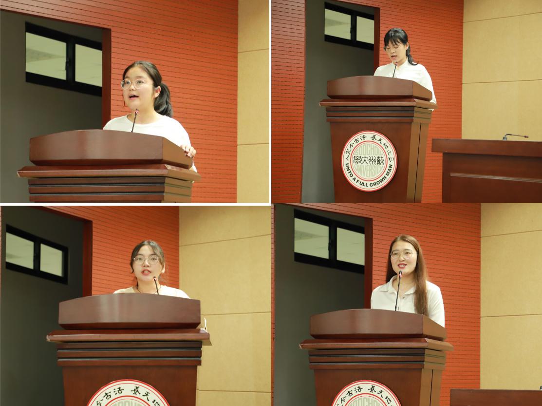 在学生代表发言中,本科生老生代表罗语轩同学从大学学习、组织文化活动、生活日常三个方面表达了对20级学弟学妹的关心,她鼓励学子们大胆逐梦;本科生新生代表童雨濛同学简要回顾了高考奋斗之路并憧憬着美好的大学生活,她号召新生们珍惜韶华,锤炼自我,放飞梦想;研究生老生代表杨肖同学结合自身实际向20级新生分享两点学习和生活经验:一是心有所向,逐梦前行,二是心怀热忱,二十不惑;研究生新生代表陈雪提出迎接研究生生活的三点建议:一是承担社会责任,二是做好个人规划,三是保持热情更加努力。