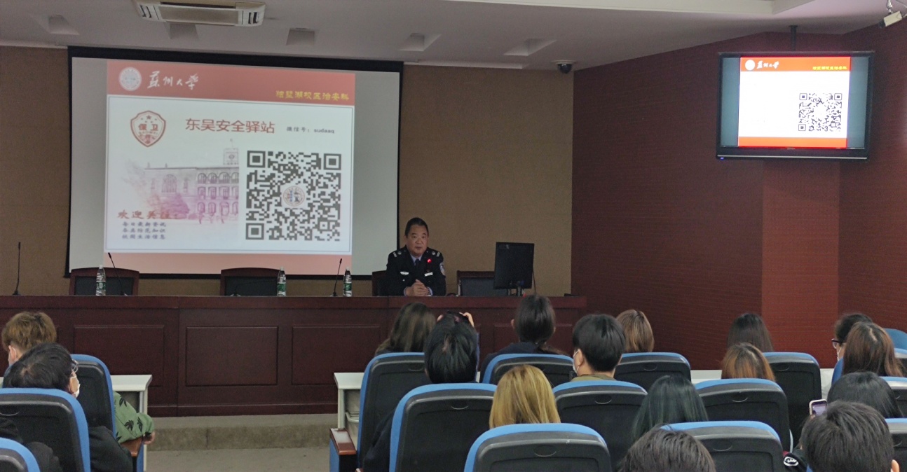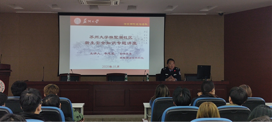 最后保卫处独墅湖校区治安科芈志坚科长给同学们进行了安全教育,普及了许多学生安全知识,比如火灾逃生、游泳溺水、网络安全隐私、宿舍用电安全和非法校园贷以及拒绝黄赌毒等一系列问题,给同学们上一场生动的新生安全教育第一课。