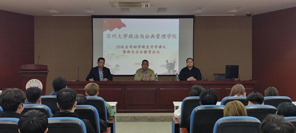 朗朗金秋开学季,徐徐打开幸福门。在这充满收获的季节里,苏州大学政治与公共管理学院迎来了2020级自考助学新同学,新生开学典礼暨新生安全教育会议于1021日下午在606-6403正式召开,由线上和线下同步进行。出席开学典礼的有政治与公共管理学院党委书记邢光晟、副院长吉文灿、自考助学办公室主任赵鹏飞、保卫处独墅湖校区治安科芈志坚科长、各班班主任以及2020级全体新生。开学典礼由吉文灿副院长主持。