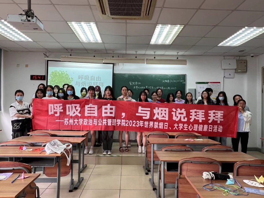 5月27日,政治与公共管理学院青年志愿者协会于独墅湖校区302-2208教室开展了“呼吸自由,与烟说拜拜”世界无烟日暨大学生心理健康日主题活动。在这个绚烂缤纷的时节,为强化禁烟意识、提高禁烟率,通过宣传、教育和互动,更好地维护大学生群体身心健康,政治与公共管理学院的志愿者们相约在5月开始一场以身心健康为最终目的的旅行,体会吸烟的危害、展望幸福的未来。