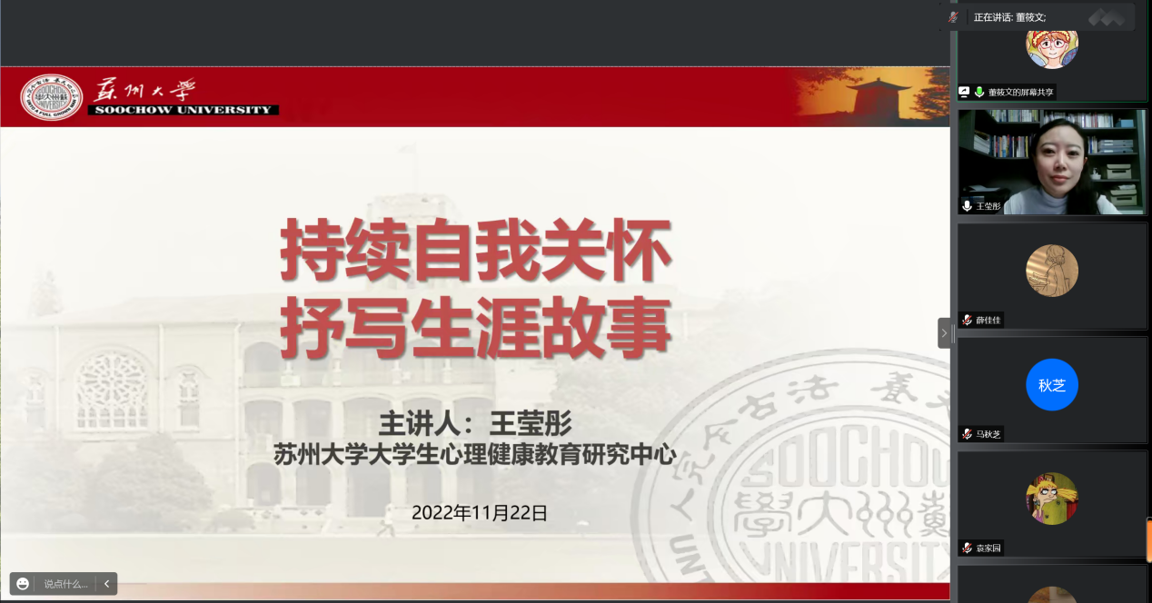 为了帮助应届毕业班同学在毕业压力前更好地认识自我,合理规划生涯,积极拥抱未来,由政治与公共管理学院团委主办、院团校承办的“青春政启航,开创心未来”系列心理讲座之“持续自我关怀,书写生涯故事”于11月23日16时以线上会议的形式展开。本次活动由中国心理学临床与注册系统注册督导师、苏州大学心理健康教育研究中心专职教师王莹彤老师作为主讲嘉宾,由政治与公共管理学院本科生辅导员薛佳佳老师主持。此外,19级本科生参与了本次主题讲座。