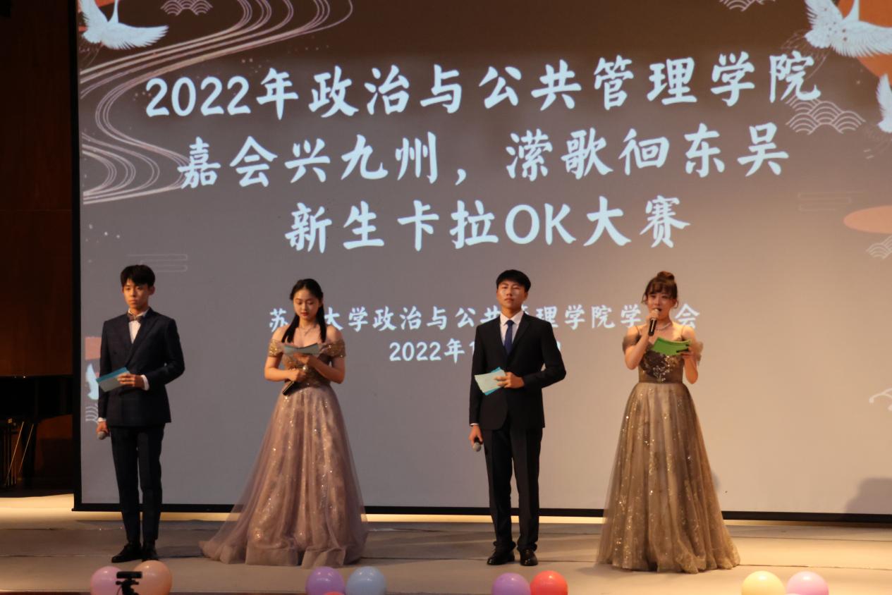 11月13日,苏州大学政治与公共管理学院2022“嘉会兴九州,潆歌徊东吴”新生卡拉OK大赛决赛在苏州大学独墅湖校区一期601音乐厅圆满落下帷幕。22级本科生辅导员张凯丽老师以及22级的各班助教出席本次活动。同时,比赛邀请了2020届Hold住我的麦克风校园歌手大赛冠军、2020届新生歌手大赛十强的刘秋萍同学,2021届hold住我的麦克风校园歌手大赛冠军宋雨航同学,苏州大学知名音乐社团五乐天社团骨干成员潘育鹏同学,2020届管院新生卡拉OK大赛亚军李季浓同学,2020届管院新生卡拉OK大赛优秀选手张雅雯同学担任评委。