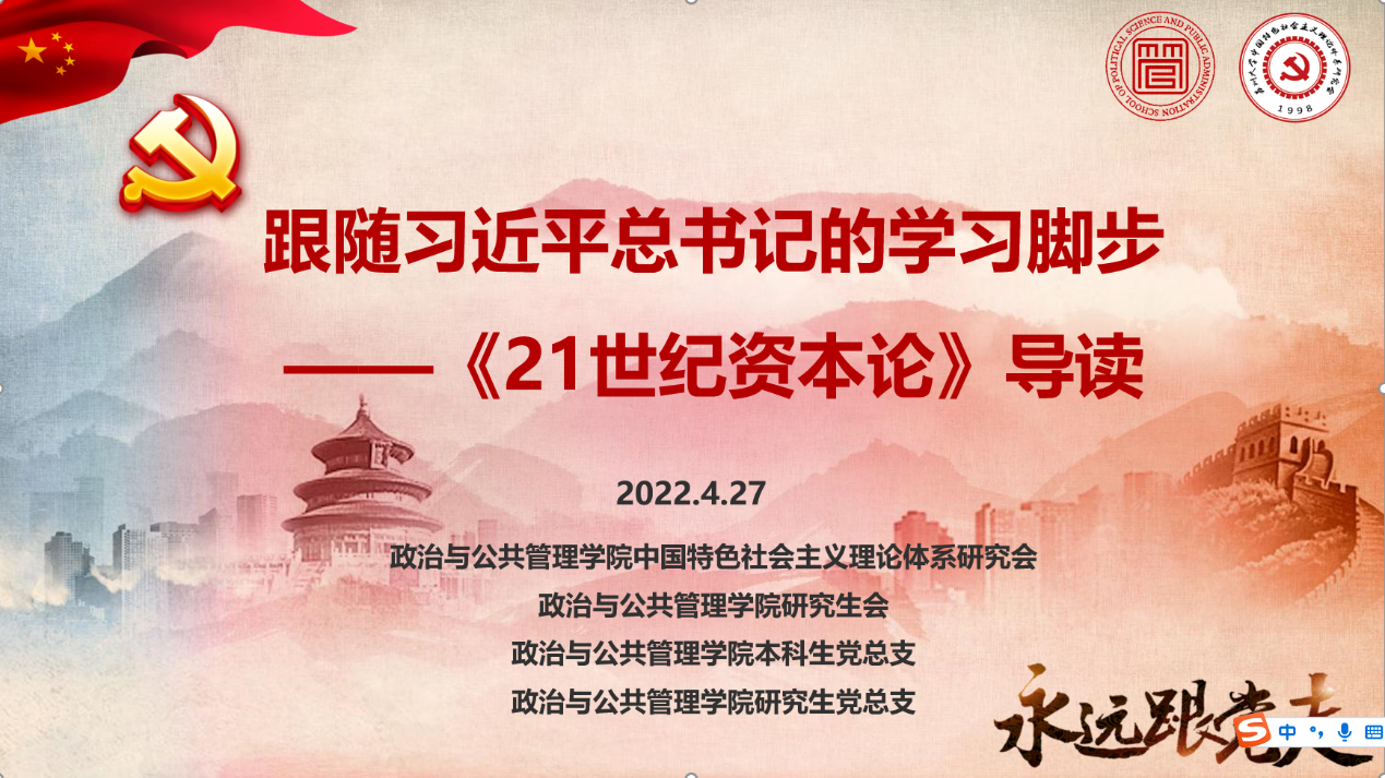 为学习贯彻习近平总书记关于青年工作的重要讲话精神,加强共青团员、青年党员的政治理论学习,引领广大青年永远跟党走、奋进新征程,以实际行动迎接党的二十大胜利召开,4月27日晚,《21世纪资本论》导读活动在腾讯会议线上成功举办。本次活动由政治与公共管理学院哲学系王一成老师担任主讲嘉宾。政治与公共管理学院中国特色社会主义理论体系研究会成员及本科生、研究生党员等百余名同学参加了本次活动。活动由中研会成员汤谨如同学主持。