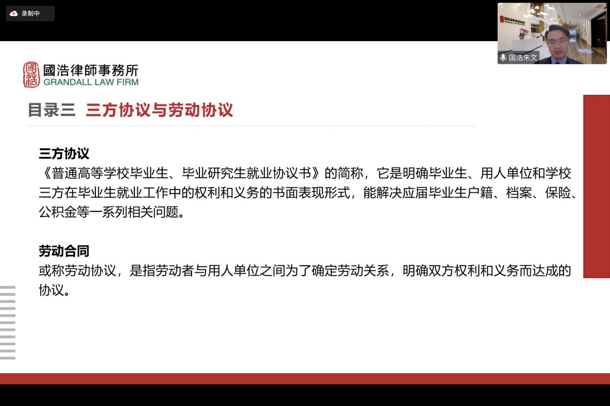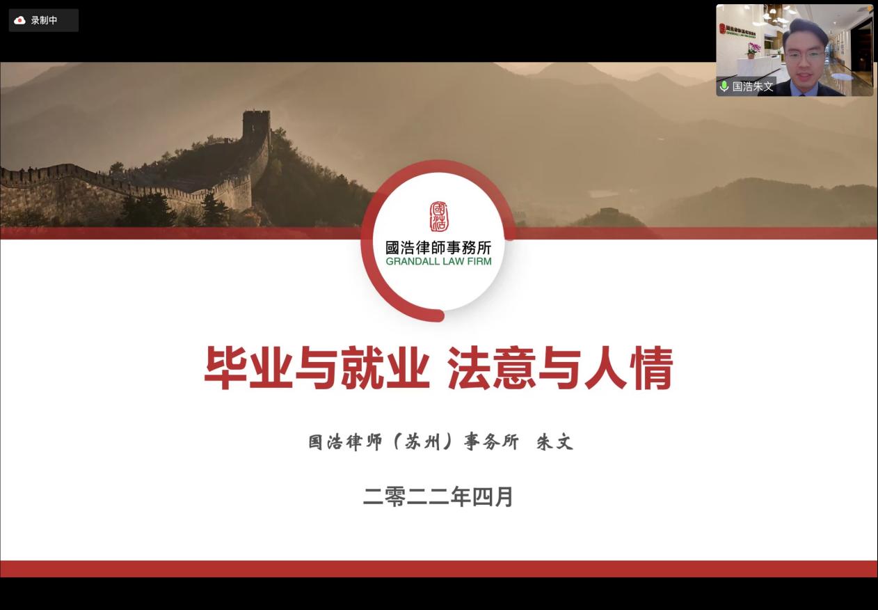 全情陪伴,服务护航。为进一步增强法律安全教育,提升就业质量,4月7日晚,职业发展活动周之“毕业与就业,法意与人情”就业签约专题指导会在腾讯会议上成功举办。本次活动特邀国浩律师(苏州)事务所律师、苏州大学2016届城市管理专业本科生校友、复旦大学法律硕士朱文担任主讲人。
