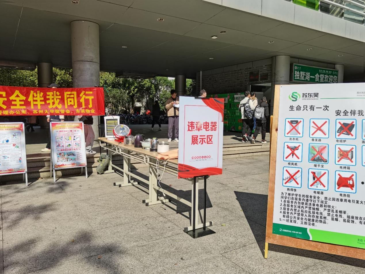为了加强同学们的风险防范意识,构建和谐安全校园,11月9日中午,由政治与公共管理学院团委主办,政治公共与管理学院宿管会和东吴物业联合承办的违禁物品展示活动在一期食堂楼下顺利进行。