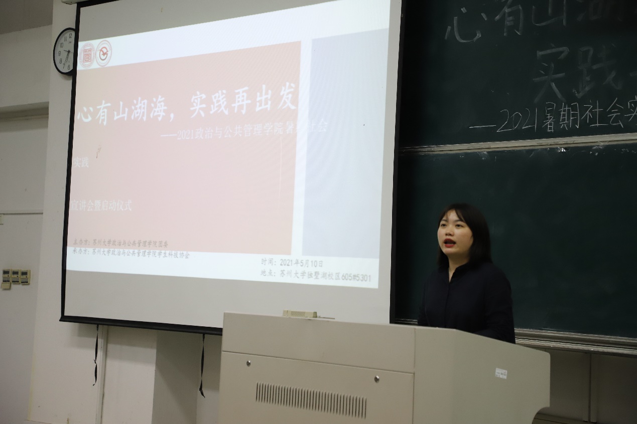 5月10日晚,由苏州大学政治与公共管理学院团委主办,苏州大学政治与公共管理学院学生科技协会承办的“心有山湖海,实践再出发”2021年政治与公共管理学院暑期社会实践宣讲会暨启动仪式在606幢教学楼5301教室成功开展。