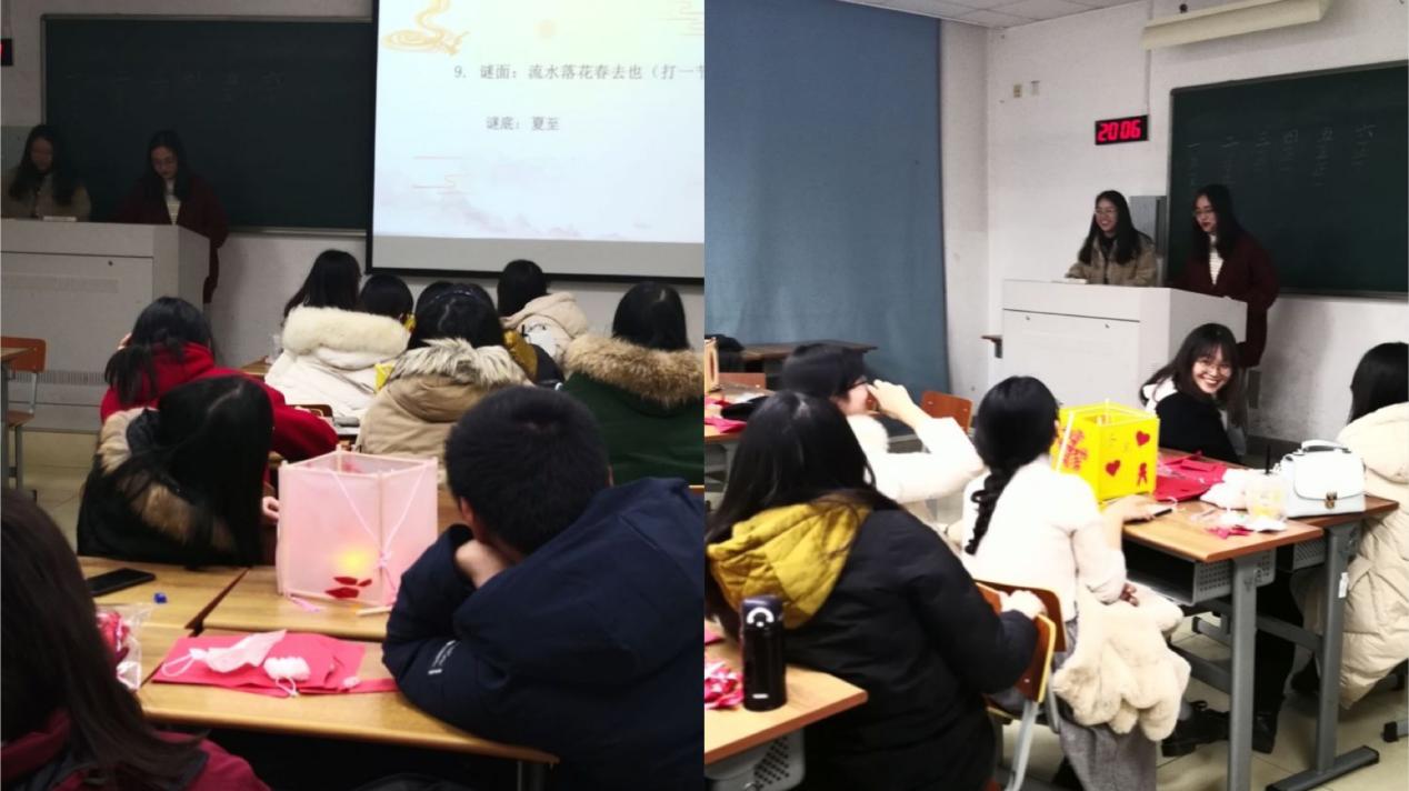 花灯展示环节中,各小组分别展示花灯,讲解本组花灯的制作理念,其余小组投票进行评选积分。最后进行猜灯谜游戏,灯谜主要从二十四节气和冬至日的相关知识取材,游戏采用举手抢答的方式,以小组方式进行积分。并通过计算每个小组的积分,评出名次、发放奖品并进行合影留念。活动过程中,同学们踊跃参与,积极互助,场内其乐融融,欢声笑语盈满整个场地。