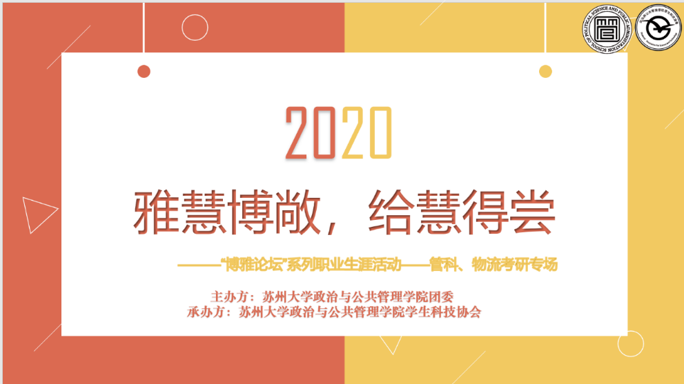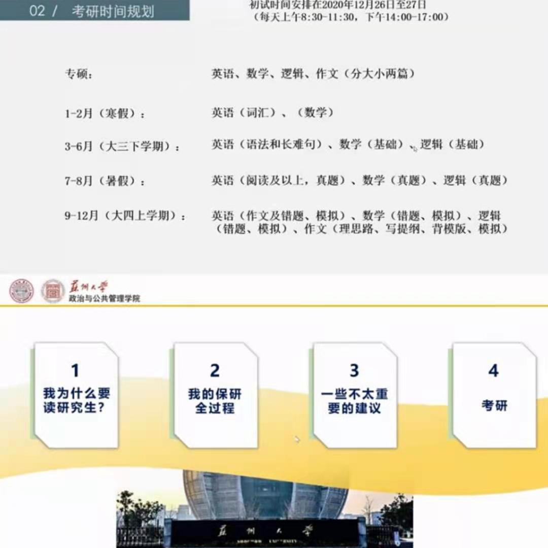 12月13日,由苏州大学政治与公共管理学院团委主办,苏州大学政治与公共管理学院学生科技协会承办的“雅正博敞,给慧得尝”博雅论坛系列职业生涯活动——管科、物流考研专场在腾讯会议线上成功举办,出席本次活动的嘉宾有同济大学管理科学与工程专业的韦鹏飞、厦门大学物流工程专业的李竹馨和北京交通大学物流工程与管理专业研究生刘啸宇。
