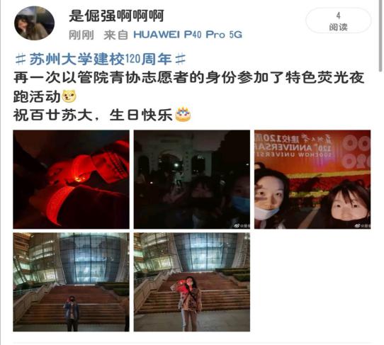 2020年10月18日,青年志愿者协会于苏州大学120周年华诞之际举行了校庆特色夜跑活动,借助萤光夜跑的形式表白苏大。活动开始了,志愿者们兴致高昂,纷纷佩戴上荧光手环,在校园留下靓丽的身影。随后,志愿者们录制了祝福视频,并在工作人员的带领下,打卡那些充满苏大风情古韵的地标性建筑。本次活动不仅表现出我院学生对于苏大的无限感激与热爱之情。志愿者们身体力行,在活动中既能强身健体,也增强了自己的公益意识。