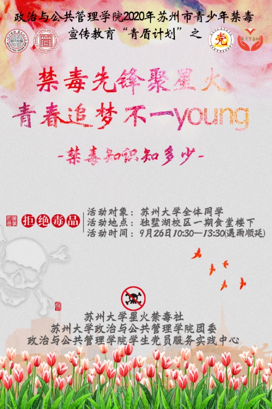 2020年9月26日,由苏州大学政治与公共管理学院团委主办、管院学生党员服务实践中心及星火禁毒社联合承办的“禁毒先锋聚星火,青春追梦不一Young——禁毒知识知多少”活动在苏州大学独墅湖校区一期食堂楼下成功举办。