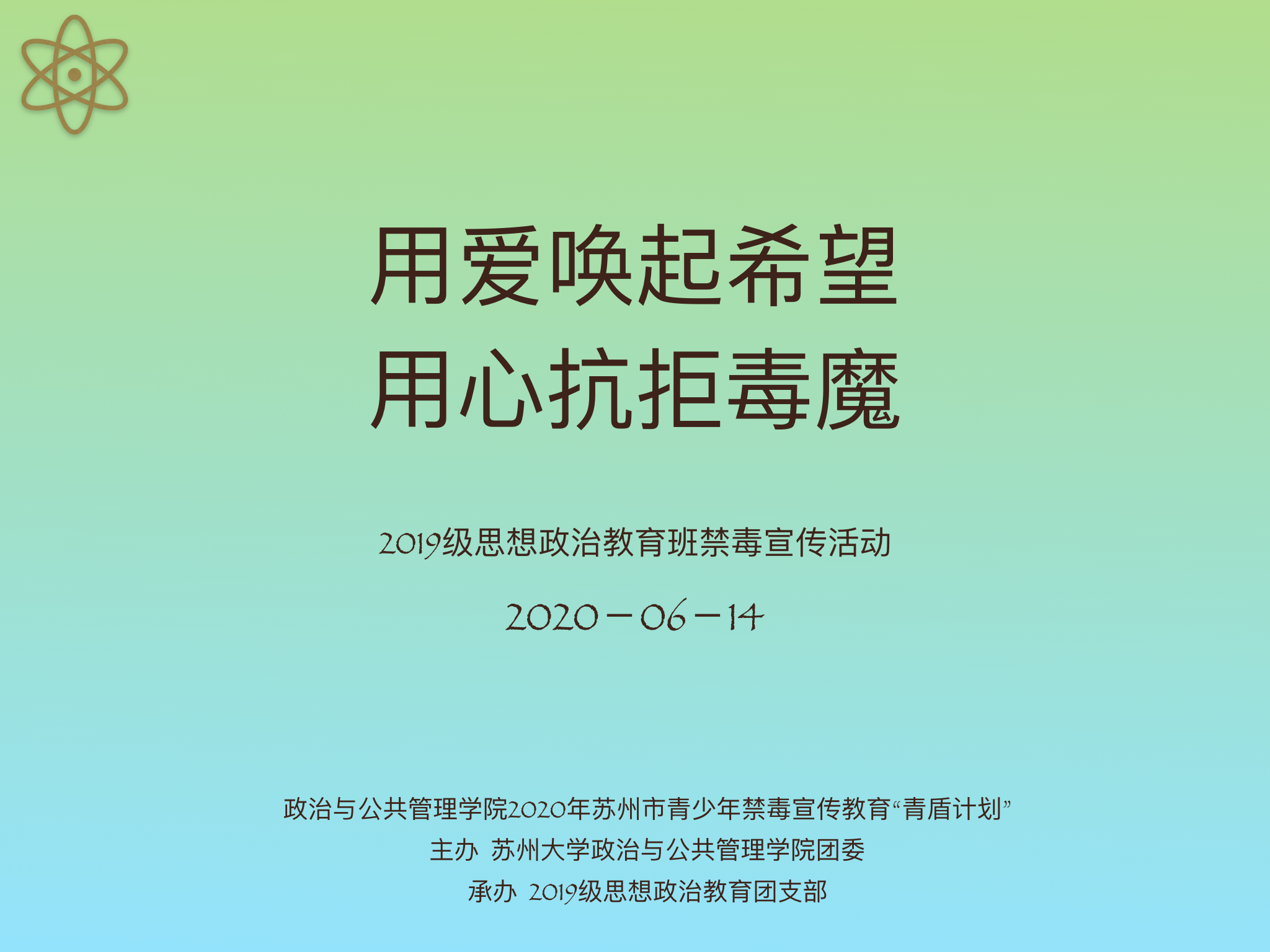 2020年6月14日下午14:00,为加强青年学生的毒品预防意识和提高青年自觉抵制毒品的能力,“用爱唤起希望,用心抗拒毒魔”禁毒宣传电影鉴赏活动在腾讯会议成功举办。本次活动由苏州大学星火禁毒社主办,19级思想政治教育团支部承办。
