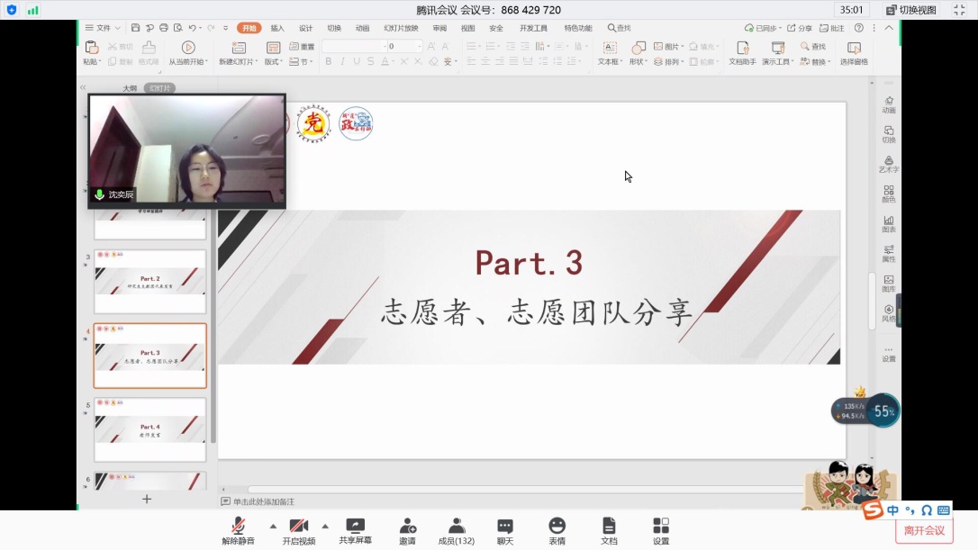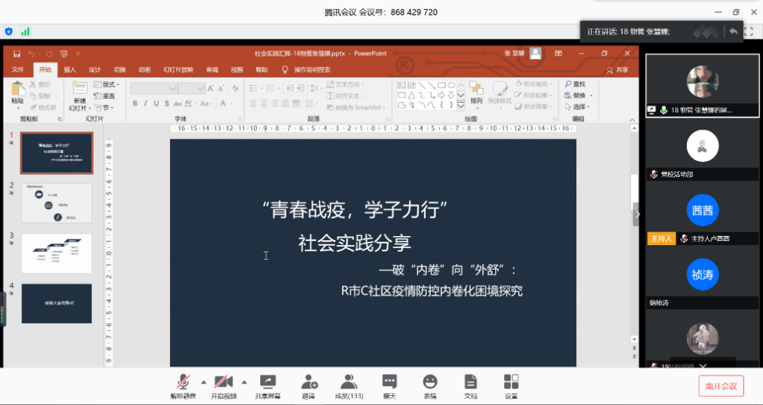 “青春战‘疫’格鲁特队”代表郭新宇同学分四个方面分享了战“疫”实践研究过程:1、一线战“疫”,向社区报到;2、青鸟陪伴,辅导医生子女;3、人物访谈,线上云宣讲;4、理论研究,志愿服务体系探讨。他希望大学生能够起到志愿服务的带头作用,在基层服务方面献出自己的一份力。张慧娜同学则从关于选题、课题准备、撰写报告三个方面分享了其团队关于破“内卷”向“外舒”R市C社区疫情防控内卷化困境探讨的过程,希望通过此次调研实践,为实现国家治理现代化提供一个接口,促进社区治理体系的完善。