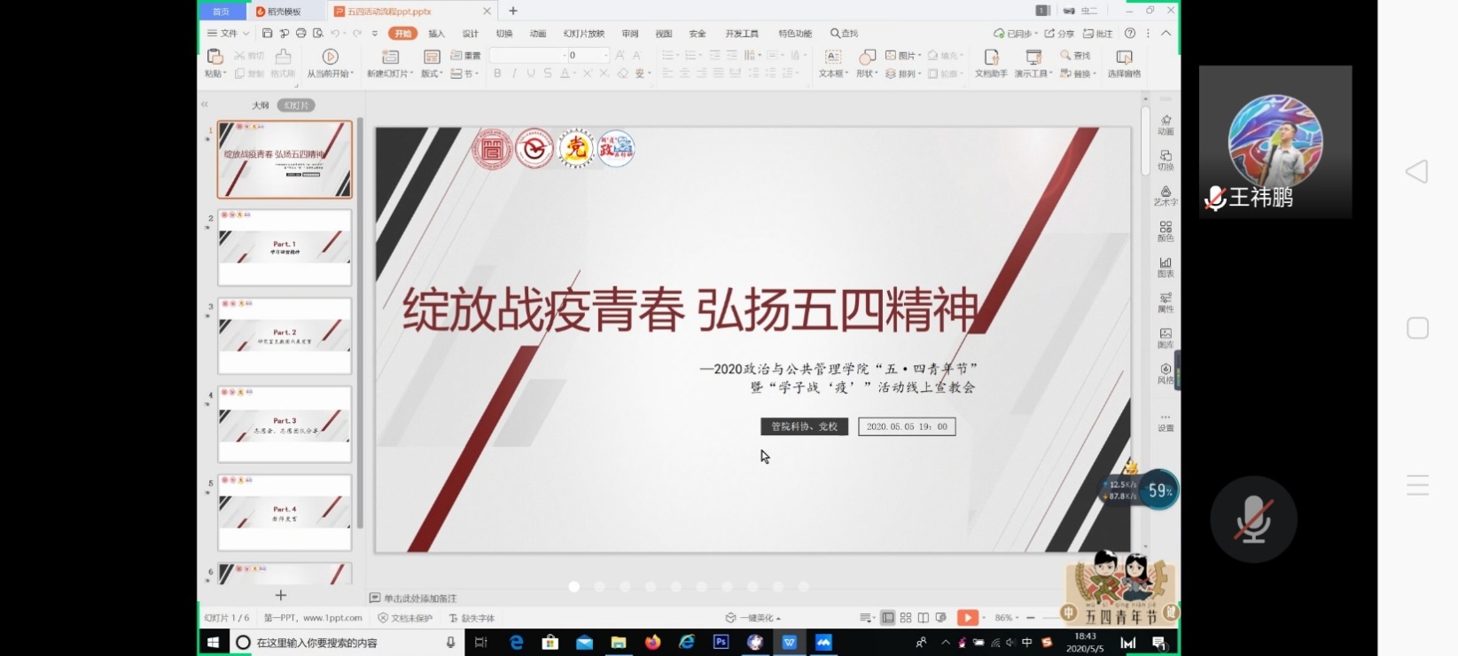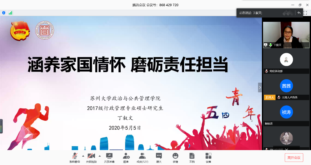 为响应学校关于开展“绽放战‘疫’青春·坚定制度自信”主题教育实践活动的号召,2020年5月5日晚,苏州大学政治与公共管理学院举办“绽放战‘疫’青春,弘扬五四精神”线上主题宣讲会。