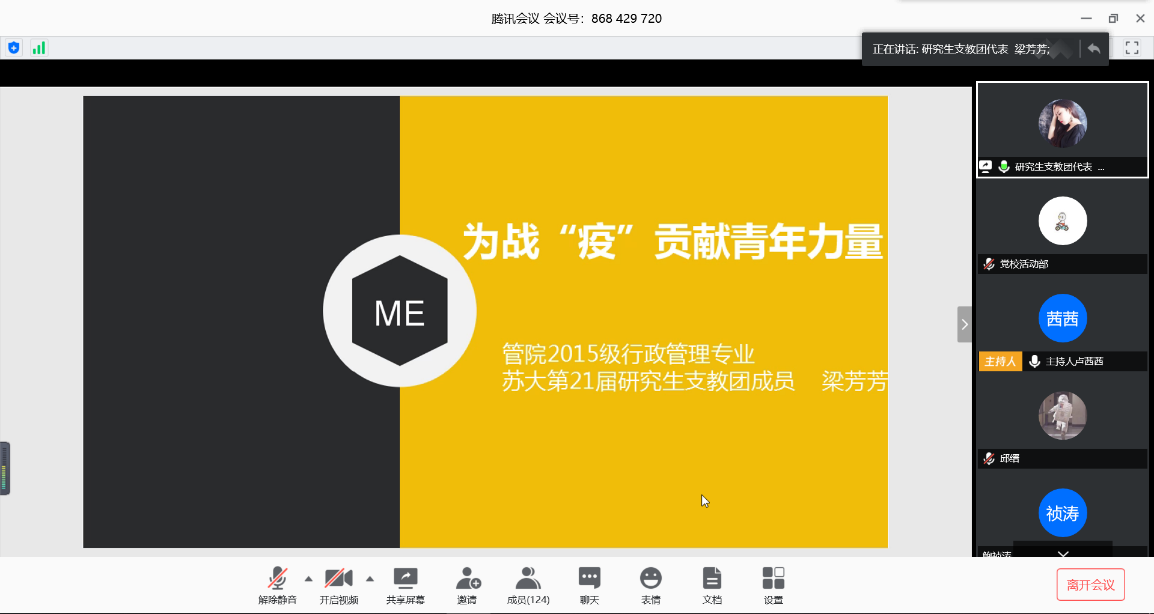 研究生支教团代表梁芳芳同学分享自己及团队在疫情期间的支教经验以及战“疫”青年力量。她表示:“抗击疫情,青年先行。在这场没有硝烟的抗疫保卫战中,虽不能身披白衣抗疫一线,却也希望竭尽所能坚守住岗位。”