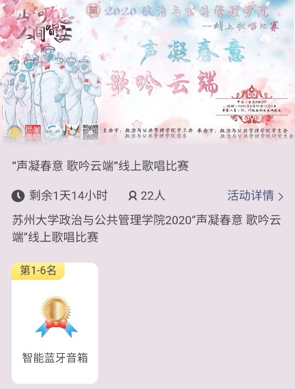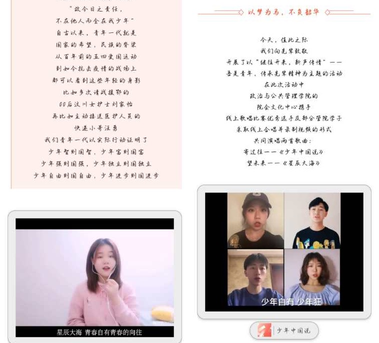 2020年4月25日至5月4日,苏州大学政治与公共管理学院“云中歌声,‘乐’动青春”系列活动成功举办。此次系列活动由“声凝春意,歌吟云端”线上歌唱比赛和“继往开来,新声传情”五四青年节同唱一首歌活动组成,在管院学子当中反响热烈。