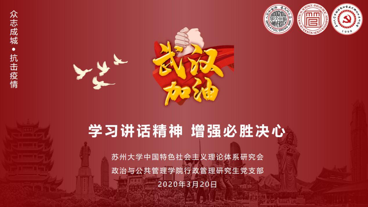 2020年3月20日下午14时,苏州大学中国特色社会主义理论体系研究会联合政治与公共管理学院行政管理研究生党支部开启师生云端座谈会,共有46位学院师生通过学习强国视频会议平台相聚“云端”,集中学习贯彻习近平总书记在湖北省考察新冠肺炎疫情防控工作时的重要讲话精神。