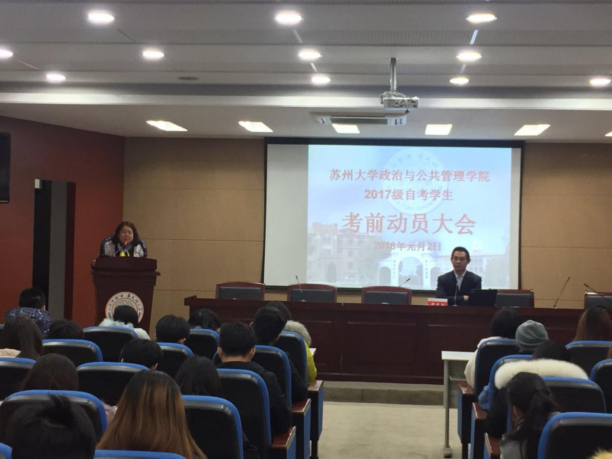 2018年1月2日下午,政治与公共管理学院分别在阳澄湖校区图书馆大报告厅和独墅湖校区6403会议室隆重举行2017级自考助学新生考前动员大会。各相关班级班主任、全体17级新生参加了会议。
