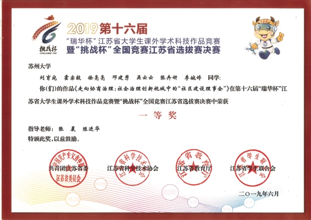 11月12日晚,由共青团中央、中国科协、教育部、中国社科院、全国学联和北京市政府主办,北京航空航天大学承办的第十六届“挑战杯”全国大学生课外学术科技作品竞赛终审决赛顺利结束。在陈进华院长和张晨老师的悉心指导下,我院本科生邓建秀、刘育宛、张卉妍、吴云云、徐亮亮、李婉婷的作品——《打造社区“小政协”:协商治理视域中的苏州工业园区“社区建设理事会”》荣获全国三等奖。