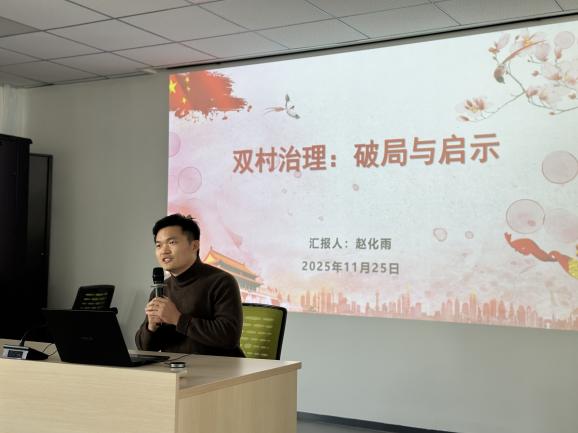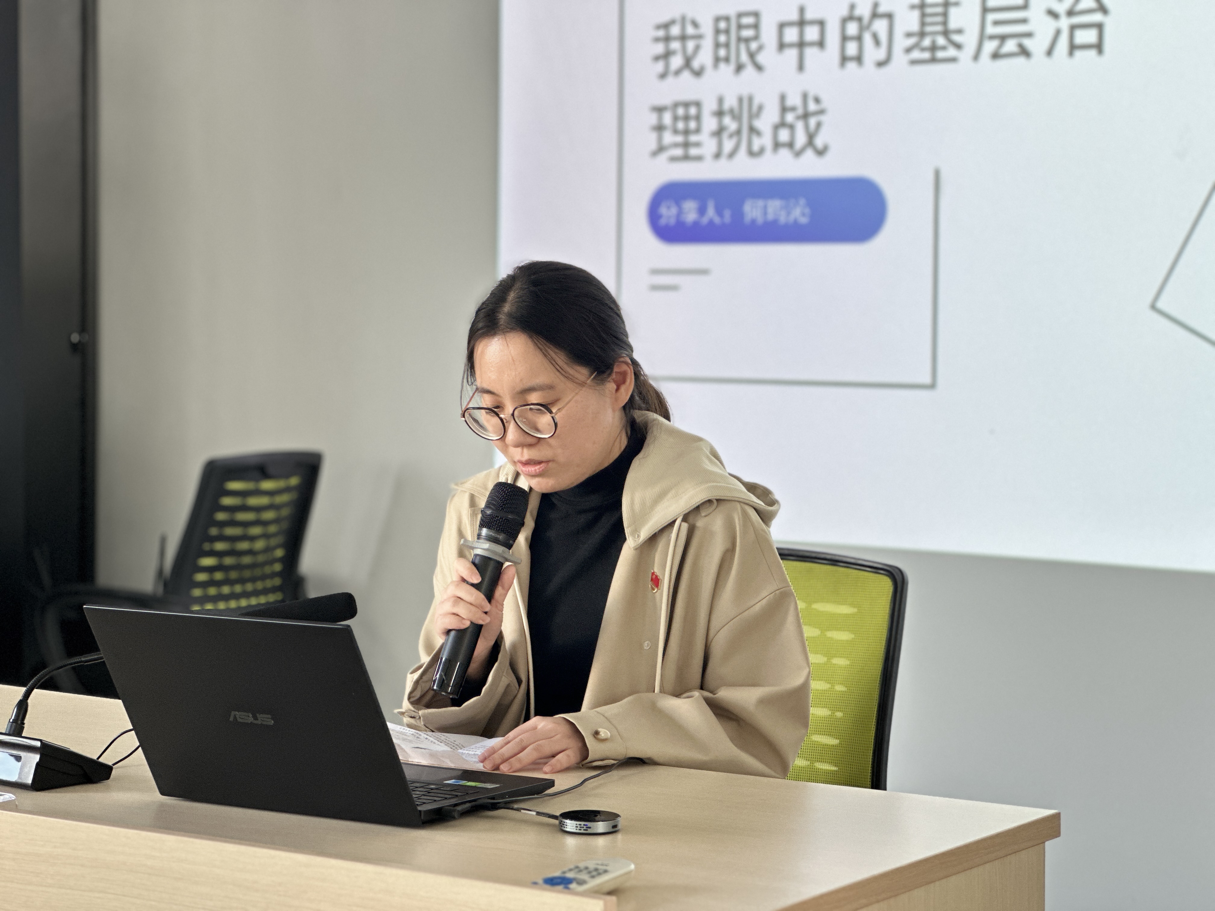 参观结束后,活动进入主题党课与交流分享环节。三名研究生党员代表围绕“基层治理的现实挑战与破局路径”,从政治与公共管理专业视角出发,分享了调研成果与实践思考,引发热烈讨论。何玙沁同志分享当前医保政策在基层落实的“最后一公里”存在梗阻,其核心在于未能真正从“人”出发,而破局的关键在于推动政府从管理者向服务者与协同者转变,通过思维转换和机制创新,实现有温度的精准治理。赵化雨同志结合自身在东山镇三山村和双湾村的调研经历,提出基层治理的成功关键在于立足本地特色资源,通过政府引导、资源整合与品牌打造,将地域优势转化为特色经济,从而实现可持续发展。叶颖同志从政治学专业出发,并结合自己在贵州和福建等省份的调研经历,由浅入深详细论述了基层治理的概念 、现实挑战、调研感悟和破局之道。