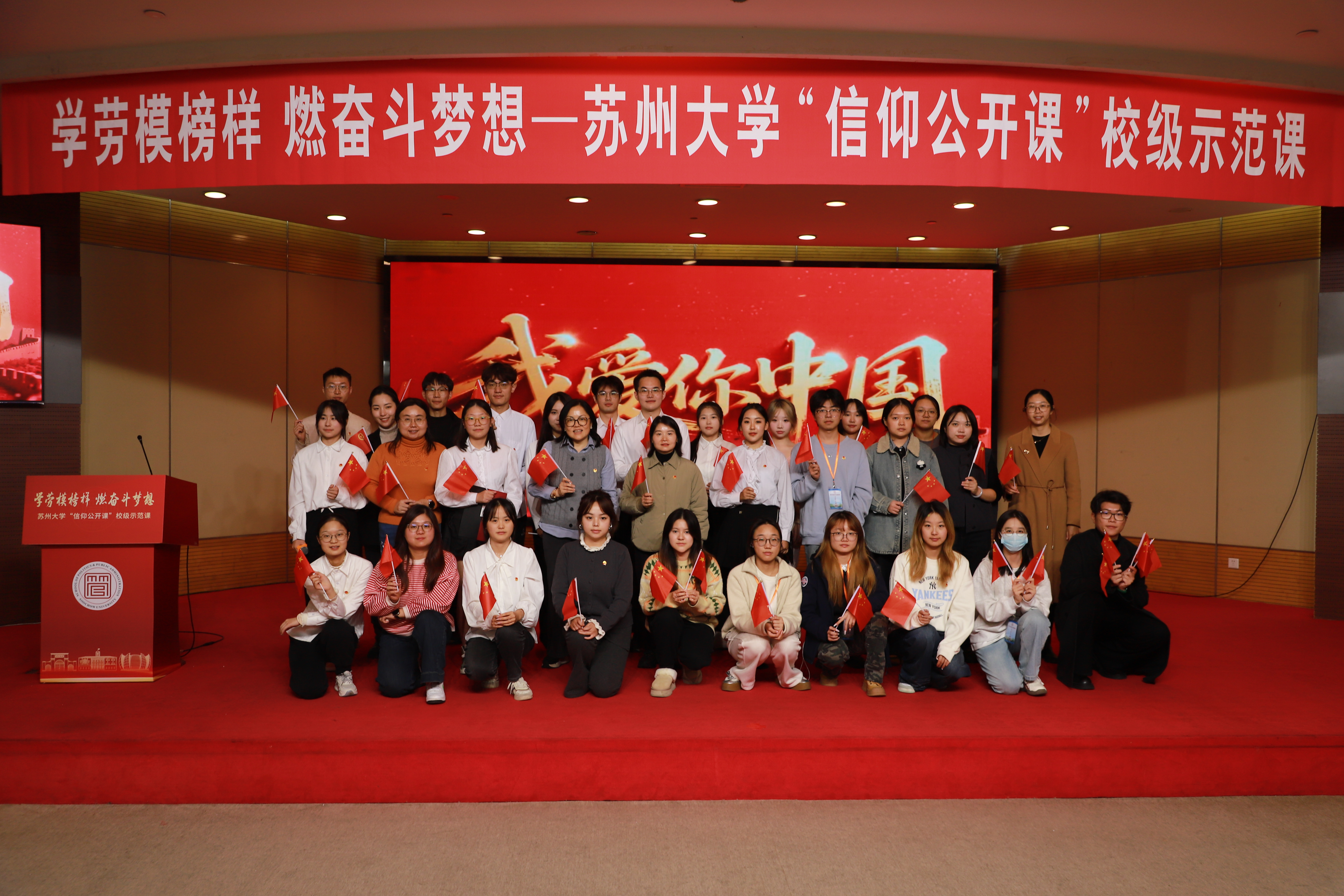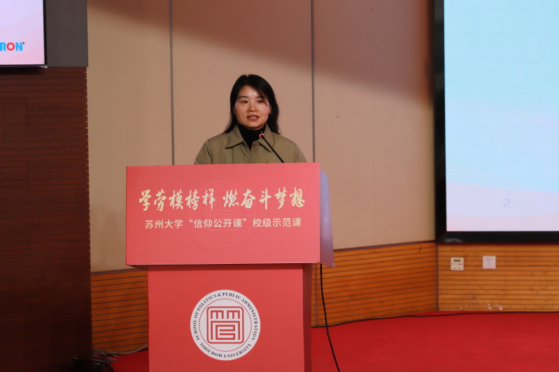 为弘扬劳模精神,凝聚奋进力量,激励青年学子砥砺前行,11月26日下午,苏州大学政治与公共管理学院在独墅湖校区炳麟图书馆学术报告厅开展以“学劳模榜样,燃奋斗梦想”为主题的“信仰公开课”校级示范课。全国劳动模范、全国“五一劳动奖章”获得者、中国工会第十八次全国代表大会代表、江苏省第十四届人民代表大会代表皮欠红,学院党委副书记、副院长李恩秀,学院团委书记张凯丽、学院辅导员老师、青马工程学员以及各班级、各组织的青年骨干共赴这堂激扬青春的信仰课。本次活动由学院学生兼职团委副书记、2024级公共管理专业研究生安嘉仪主持。