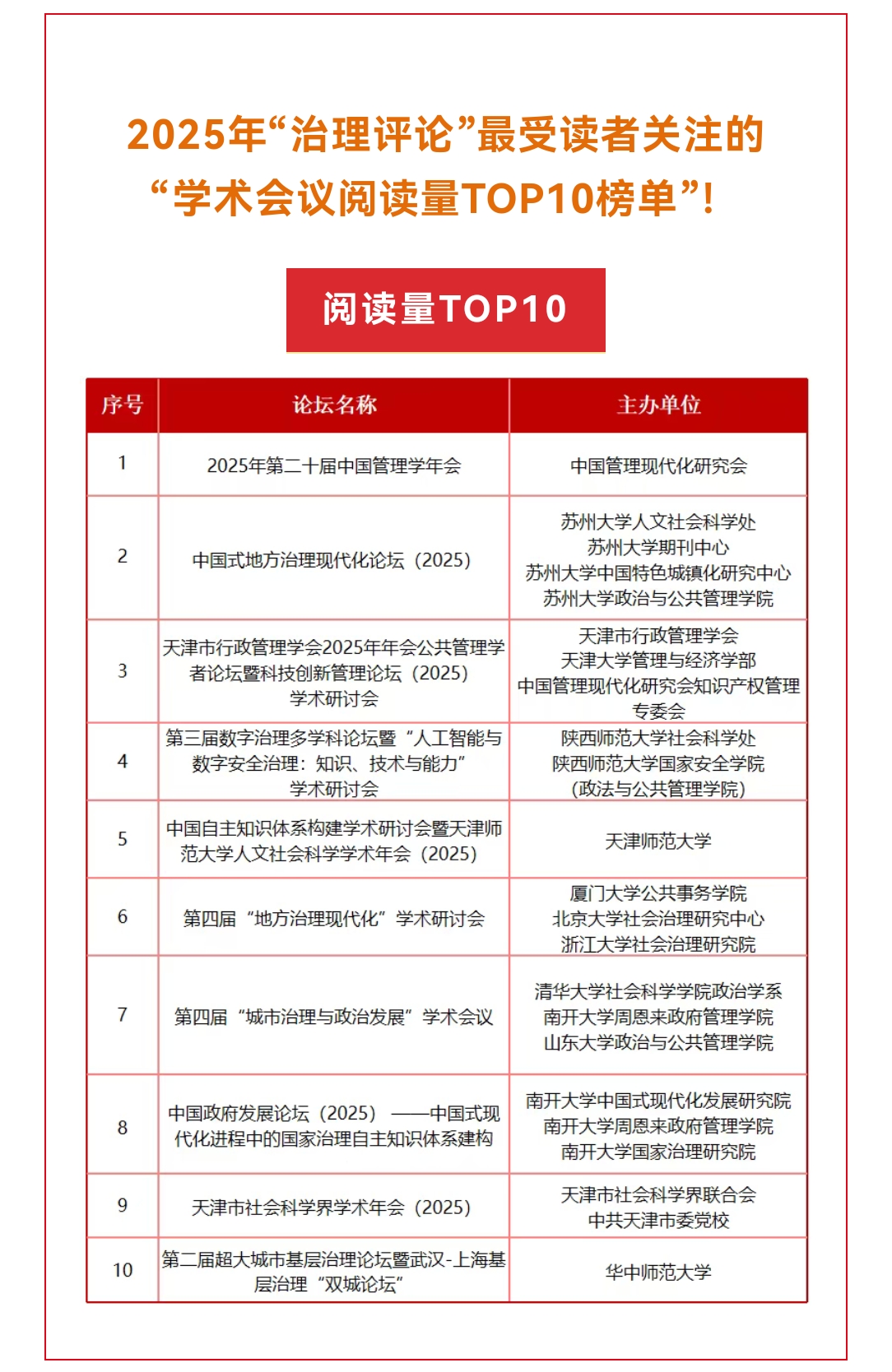 “治理评论”公众号2025年度共推送会议预告及议程53篇,累计阅读量达3万余次,其中7篇文章阅读量超1000次。本次榜单根据2025年全年推送文章的阅读量、点赞数、转发量综合排序,充分反映了读者对学术会议的关注热度与学术共同体的互动活力。在此背景下,“中国式地方治理现代化论坛(2025)”能够从众多高水平学术会议中脱颖而出,进入榜单第二位,充分体现了其学术分量与传播价值。