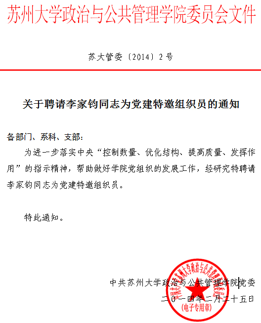 为进一步落实中央“控制数量、优化结构、提高质量、发挥作用”的指示精神,帮助做好学院党组织的发展工作,经研究特聘请李家钧同志为党建特邀组织员。