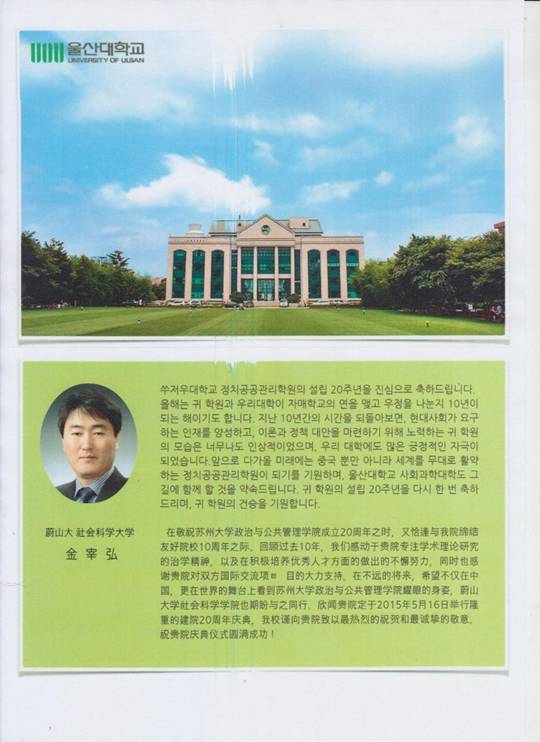 来自韩国蔚山大学社会科学学院的贺信