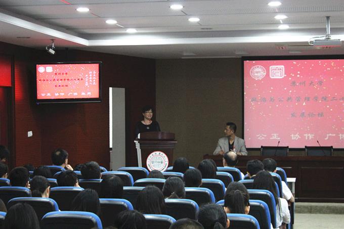 2015年5月16日下午,政治与公共管理学院二十周年发展论坛之校友发展论坛——成长发展与经验启示,在苏州大学独墅湖校区6403会议室隆重举行,本次论坛邀请到了我院校友镇江市第三中学校长朱彩虹教授、苏州广大投资集团有限公司王清总经理、凯恩咨询有限公司总经理王挺、银河天成集团执行董事潘勇先生。政治与公共管理学院党委书记张才君、副书记邢光晟等参加了论坛。参加论坛的还有我院分团委和学工办的老师、院本科生、研究生、MPA学生共120多人。本次论坛由院长助理吉文灿主持。