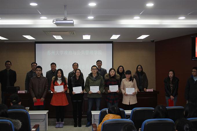 2013年12月11日,我院隆重召开自考助学学生自律委员会成立暨奖学金颁奖大会。参加会议的有:苏州大学成人教育学院吴建军副院长、政治与公共管理学院党委张才君书记、姜建成院长、潘晓珍副院长、邢光晟副书记、自考助学办公室宋煜萍主任、学生工作办公室谢燕兰主任、团委尹婷婷书记、各班班主任以及当选的学生自律委员会成员、奖学金获得者、各班班委、新生代表等。会议在庄严的国歌声中揭开序幕。会议由院长助理吉文灿主持。