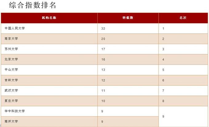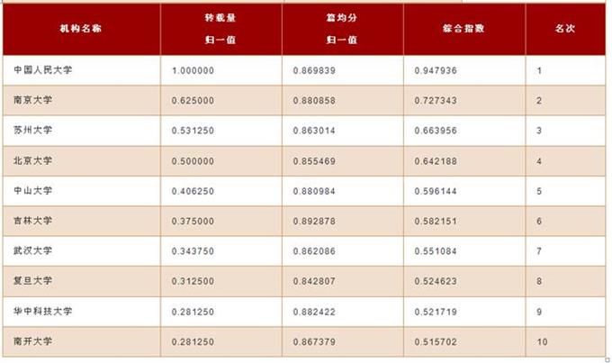 本学科高等院校转载全文428篇,约占本学科转载总数(567篇)的75.5%,涉及高等院校148所,约占本学科涉及作者机构总数(227个)的65.2%。本次对3篇之上进行转载量和综合指数计算并选取前10名进行排序。
