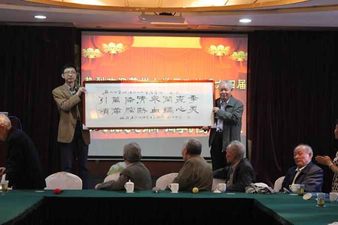 64届政教班团支部书记戴家余向学院赠送了由校友温广玉题写的“引万条清泉润桃李,倾满腔热血铸心灵”纪念匾;校友戴启群、朱沛源向与会的领导、老师赠送了纪念品。座谈会在充满回忆、感恩、深情、惜别的气氛中结束。