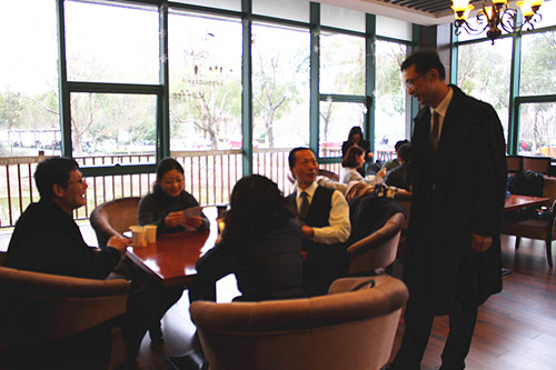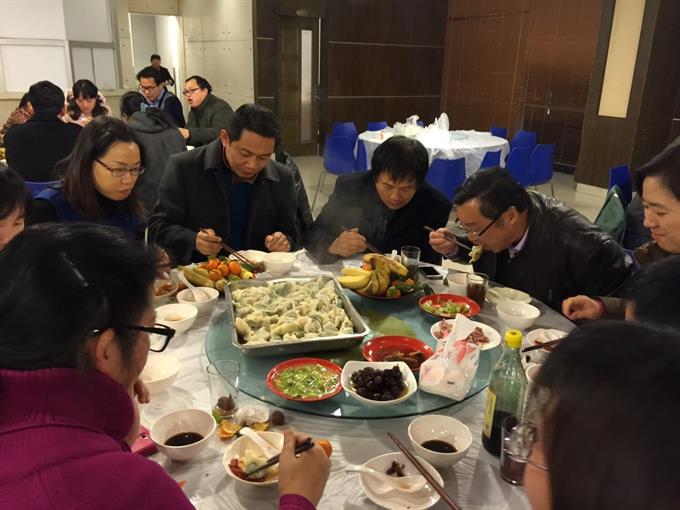 下午4点20分,所有参加活动的老师齐聚802教工食堂二楼自助餐厅,包饺子活动正式开启。会包的老师们是八仙过海各显神通,完美的饺子形状、熟稔的操作手法充分展示了他们的包饺子本事。不会包的老师也不甘寂寞,他们虚心向会包的老师请教,现学现包,也有模有样。在大家的共同劳动下,几千个饺子很快就完成了。以章小波老师为代表的小组还用饺子摆出了别致的“吉”字,预示着羊年大吉,这一造型获得老师们的一致赞誉,纷纷与之合影留念。晚上6点,浓情饺子宴正式开始,在这几千个饺子中工会还特意制造了十二只神秘饺子,这些神秘饺子里包着干红辣椒这一特殊馅料,吃到神秘饺子的老师可以获得具有收藏价值的金币一枚。此次活动的金币由哲学系的李红霞博士赞助,特此感谢!过了一会,热腾腾饺子上桌了,还有清爽的凉菜以及金院长自制的杨梅酒相佐。大家边吃边交流,时而品评饺子的味道和形状,时而聊聊有关饺子的习俗和做法,时而又猜测哪个才是神秘饺子,整个餐厅成为一片欢乐祥和的海洋。