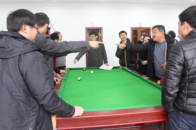下午2点,在管院教工之家健身房里,开心桌球比赛率先拉开联欢会大幕。参赛老师被分成红、蓝两队,每组出一名队员对决,输赢计入本组积分。经过激烈地角逐,红蓝两队比分进入持平的胶着状态。比赛最后的胜负落在最后一组选手吉文灿与罗志勇两位老师的身上,他们的比赛结果将直接决定所在小组的胜负。两位老师小心谨慎,你来我往,先礼后兵,纠缠得不可开交,比赛气氛异常紧张。比赛到最后只剩下一枚黑球,谁先打进即获胜。随着吉文灿老师一个完美的出杆、撞球动作,黑球成功入袋,在大家的鼓掌声和欢呼声中台球比赛完美收官。赛后,台球比赛负责人文体委员甄勇给所有参赛选手颁发了奖品。