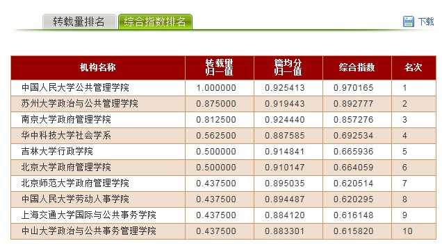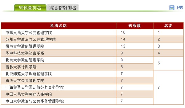 据中国人民大学人文社会科学学术成果评价研究中心发布的信息,在高等院校公共管理学科转载排名中,我院公共管理类排名表现突出,排名第2,比2013年排名第3位上升了一位。此次学科排名根据论文作者所属机构,从转载量和综合指数两个量度,按专业学科对高校及其二级院所进行排名。