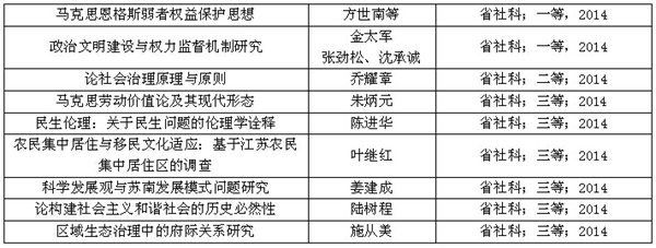3.省政府哲学社会科学优秀成果奖:2014年度获江苏省第十三届哲学社会科学优秀成果奖9项,其中一等奖2项 。