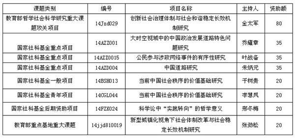 1.高层次课题:2014年度,新增教育部重大课题攻关项目1项(全省共2项),国家社科基金课题6项,其中重点课题3项,教育部重点基地重大课题1项。