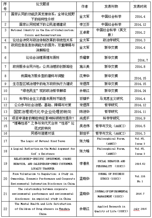 2.学校奖励的权威期刊论文:2014年,该院在学校奖励的权威期刊共发表论文22篇,其中顶级期刊《中国社会科学》发表3篇(全校共3篇)。