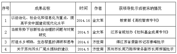 4.有重要影响的研究报告:2014年,该院有4篇研究报告为省部级单位采纳或得到有关领导人批示,其中2篇研究报告是为我校首次入选教育部《高校智库专刊》(江苏省本年度共入选3篇)与江苏省《社科基金成果专刊》。