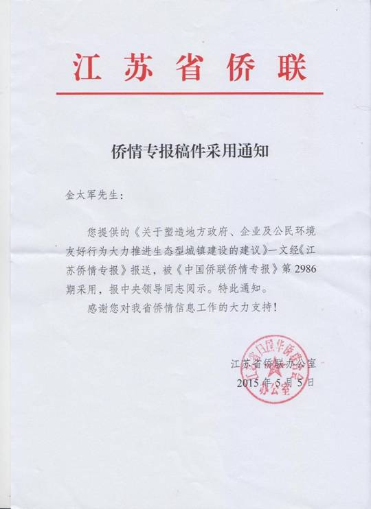 近日,从江苏省侨联获悉,我院院长、江苏省新型城镇化与社会治理协同创新中心主任金太军教授的《关于塑造地方政府、企业及公民环境友好行为大力推进生态型城镇建设的建议》一文,经《江苏侨情专报》报送,被《中国侨联侨情专报》第2986期采用,并报中央领导批示。