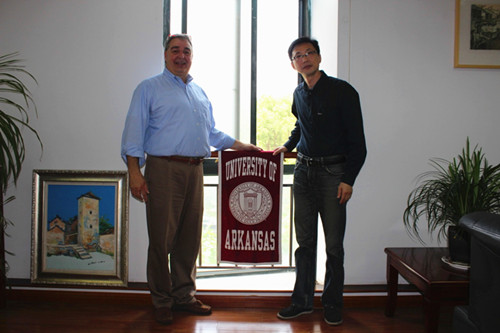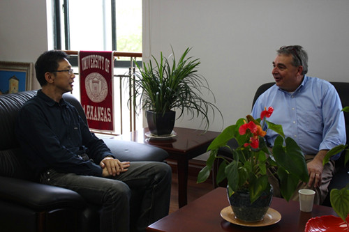课后,John Kent博士拜见了学院党委书记张才君和党委副书记、副院长邢光晟。John Kent博士表示阿肯色大学非常看好这个合作项目,自己也非常喜欢中国,进入阿肯色大学前他就曾经在中国香港工作过,有许多中国的好朋友,他希望尽快尽早地熟悉参与项目的中国学生,因为在未来去美国的学习中,将由他全程负责管理中国学生的学习和生活。
