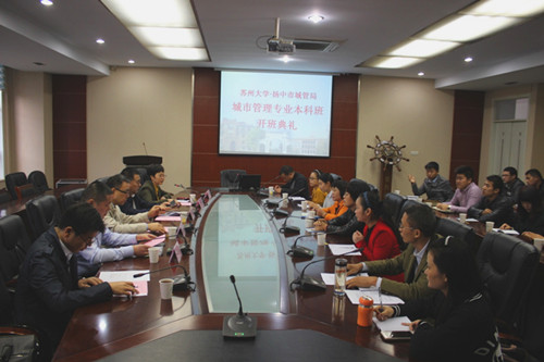 2015年10月29日上午,在独墅湖校区606楼6317会议室隆重举行了苏州大学•扬中城市管理局城市管理专业自考本科学历班开班典礼,学院党委书记邢光晟、副院长潘晓珍、院长助理邵健以及扬中市城管局陆元国副书记、赵阳副局长、局办黄伟良主任参加了开班典礼,典礼由潘晓珍副院长主持。