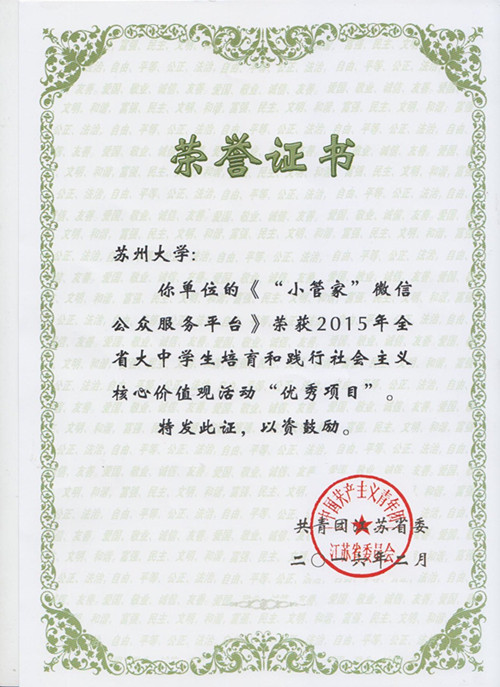 2013年7月,学院积极创新新媒体环境下的共青团工作,创立了“小管家”微信公众平台(2016年1月更名为“苏大小管家”)。两年多来,“苏大小管家”发挥着大学生思想引领、文化建设、学业指导和生活服务等职能,服务青年学生成长成才。学院团委深入贯彻落实共青团中央、全国学联《关于在大中学生中深入开展培育和践行社会主义核心价值观活动的通知》以及团省委和校团委相关工作要求,创新利用“小管家”微信公众平台唱响主旋律,壮大网络主流思想舆论,积极培育和践行社会主义核心价值观,引导和帮助团员青年自觉将社会主义核心价值观内化于心、外化于行。