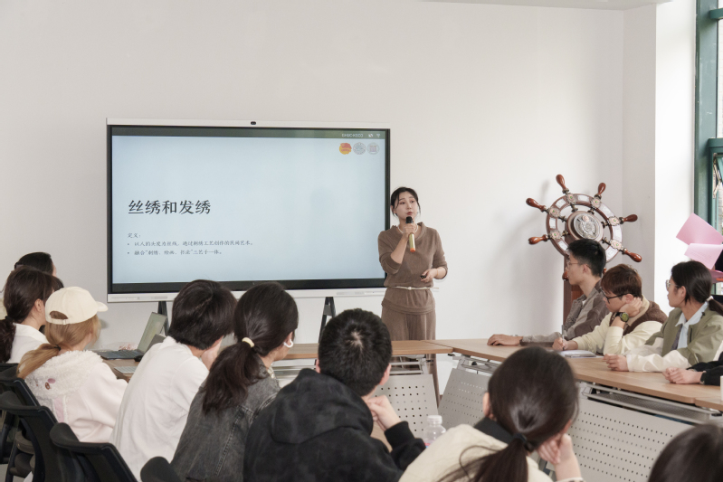 在郭晓琪老师的指导下,同学们现场体验了散套针、滚针等基础针法,在指尖技艺中感受非遗魅力。郭晓琪老师勉励在场青年:非遗传承不仅是技艺延续,更是精神传承。希望同学们学习苏绣“精益求精、持之以恒、守正创新”的匠人精神,以专注之心对待学业,以坚守之志追逐梦想,把文化自信内化于心、外化于行,在新时代担当起传承中华优秀传统文化的青春使命。