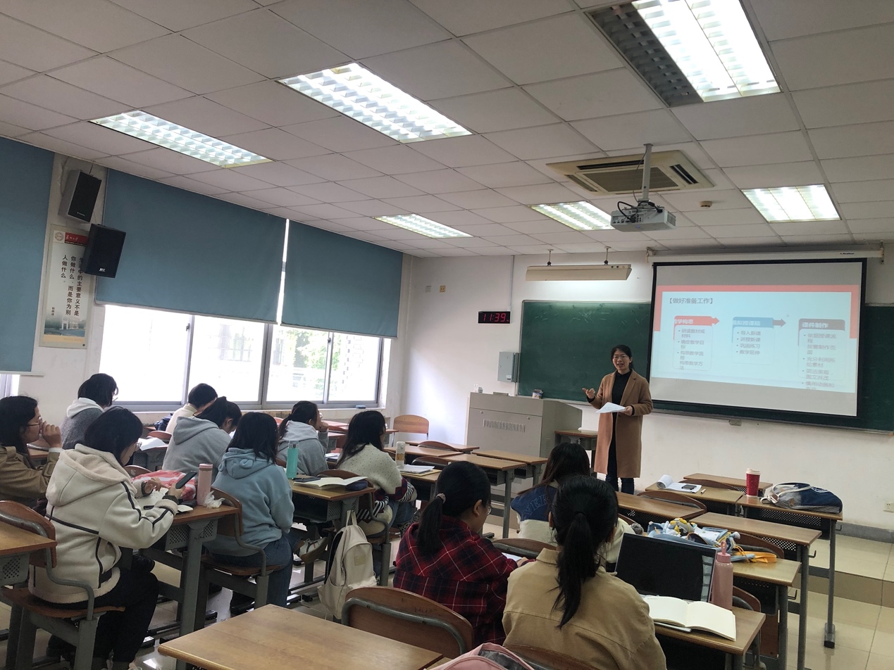 在七位同学精彩的模拟上课展示后,颛孙老师作了题为“无生课堂亦生彩——模拟课堂的技巧”的讲座。首先,她带领学生弄清了模拟授课的概念,“模拟课堂”作为一种新式教学形式,要求教师在“无生”的课堂上,同时展现教师的教和学生的学,与普通授课和说课相比,模拟上课要求教师能够通过动作和语言模拟授课情景,更侧重于教师的综合素质和能力。其次,颛孙老师指出了模拟授课时的注意事项,肯定了同学们对情境创设的合理性和思辨话题的采用,同时也指出存在的问题,作为教师招聘采取的一种面试方式,缺乏教学经验的师范学生要注重相关细节,要关注与学生的互动手势,能猜测学生的课堂状态,以及对时间的把控。之后,颛孙老师对课堂的设计延伸、板书设计等方面做了指导,并寄语同学们在未来的教学中,要能分清概念,把握基础技能,打开教学思路,有所增进。在活动的最后,大家积极参与了讨论,大胆提出自己的疑惑,通过这次与他人思维碰撞的机会,发现自身的不足,并探讨提升的策略。