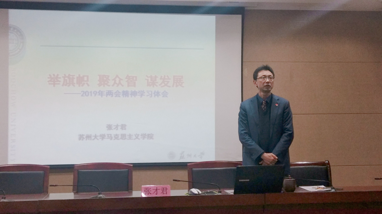 接下来,张才君老师为入党积极分子和预备党员授课。课程主题为“举旗帜 聚众智 谋发展——2019年两会精神学习体会”。课程内容分为“两会的历史沿革”、“2019年两会的主要精神”、“人民群众普遍关心的重点问题”和“学习贯彻落实两会精神的思考”四个部分。首先,张才君老师以风趣幽默且精义时出的语言介绍了两会的由来、两会的功能作用及其重要的意义,并详细地讲解了中国人民政治协商会议与人民代表大会的组成、性质和形式。