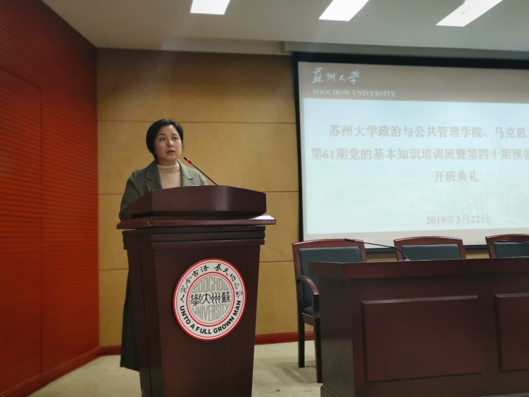 为了提高入党积极分子和预备党员们的思想水平以及其党性修养,政治与公共管理学院学生党员服务实践中心于3月22日下午在独墅湖校区一期606教学楼6403会议室开展了第61期党的基本知识培训班暨第40期预备党员培训班开班典礼暨第一次党的基本知识集中授课活动。出席本次活动的嘉宾有马克思主义学院党委书记张才君老师,政治与公共管理学院党委副书记兼副院长尹婷婷老师、本科生党总支书记兼学工办主任甄勇老师、专职组织员曾永安老师、本科生第一党支部书记董筱文老师、本科生第二党支部书记张凯丽老师。