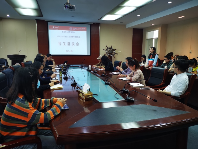 为全面掌握本学期开学以来本科教学整体运行情况,进一步提升教学质量和加强本科生学风建设,4月28日下午,学院召开了2020-2021学年第二学期本科期中教学检查师生座谈会。学院党委书记邢光晟,党委副书记、副院长徐美华,院长助理、哲学系党支部书记庄友刚,院专职本科教学督导沈磊,管理科学系副主任宋典、政治学优势学科秘书李丽红,青年教师代表朱晓亚、王一成,教务办卢荣辉、李佳嘉等老师,以及各年级各专业学生代表,约50余人参加了本次座谈会。会议由副院长黄建洪主持。