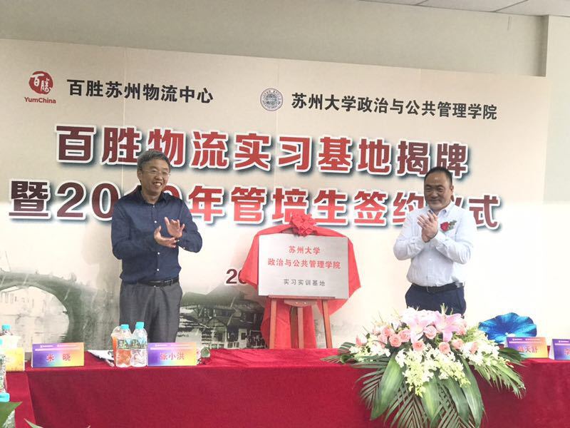 出席下午合作协议签订仪式的领导与嘉宾有:苏州高新区浒墅关镇党委副书记陈方旻、百胜(中国)控股公司总经理韩天舒、百胜(中国)控股公司营运总监李峰、百胜(中国)控股公司人力资源总监Jason、百胜苏州物流中心各部门经理,政治与公共管理学院管理科学系主任张小洪教授、管科系支部书记朱晓老师、中外合作办学项目副主管林璐老师。