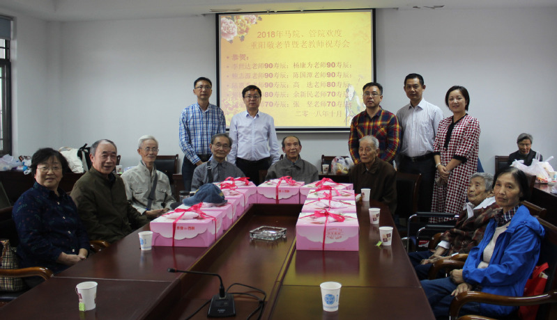 金秋十月,丹桂飘香,在改革开放40周年之际,适逢李世达老师、杨康为老师、鲍志源老师、陈国潭老师、陆惠秀老师90岁大寿,高选老师、郁铭余老师80岁大寿,余新民老师、侯新芳老师、张坚老师70岁大寿。10月17日下午在校离退休处的大力支持下,政治与公共管理学院和马克思主义学院在校离退休处一楼会议室联合举办了2018年退休老同志集体祝寿会,政治与公共管理学院院长陈进华,党委书记邢光晟,副院长吉文灿,党委副书记、副院长尹婷婷,马克思主义学院党委书记张才君等出席了此次集体祝寿会。会议由政治与公共管理学院退协负责人沈磊主持。